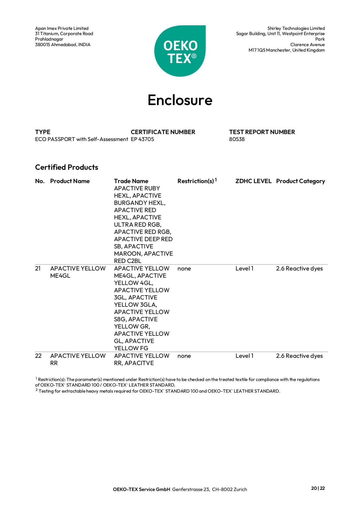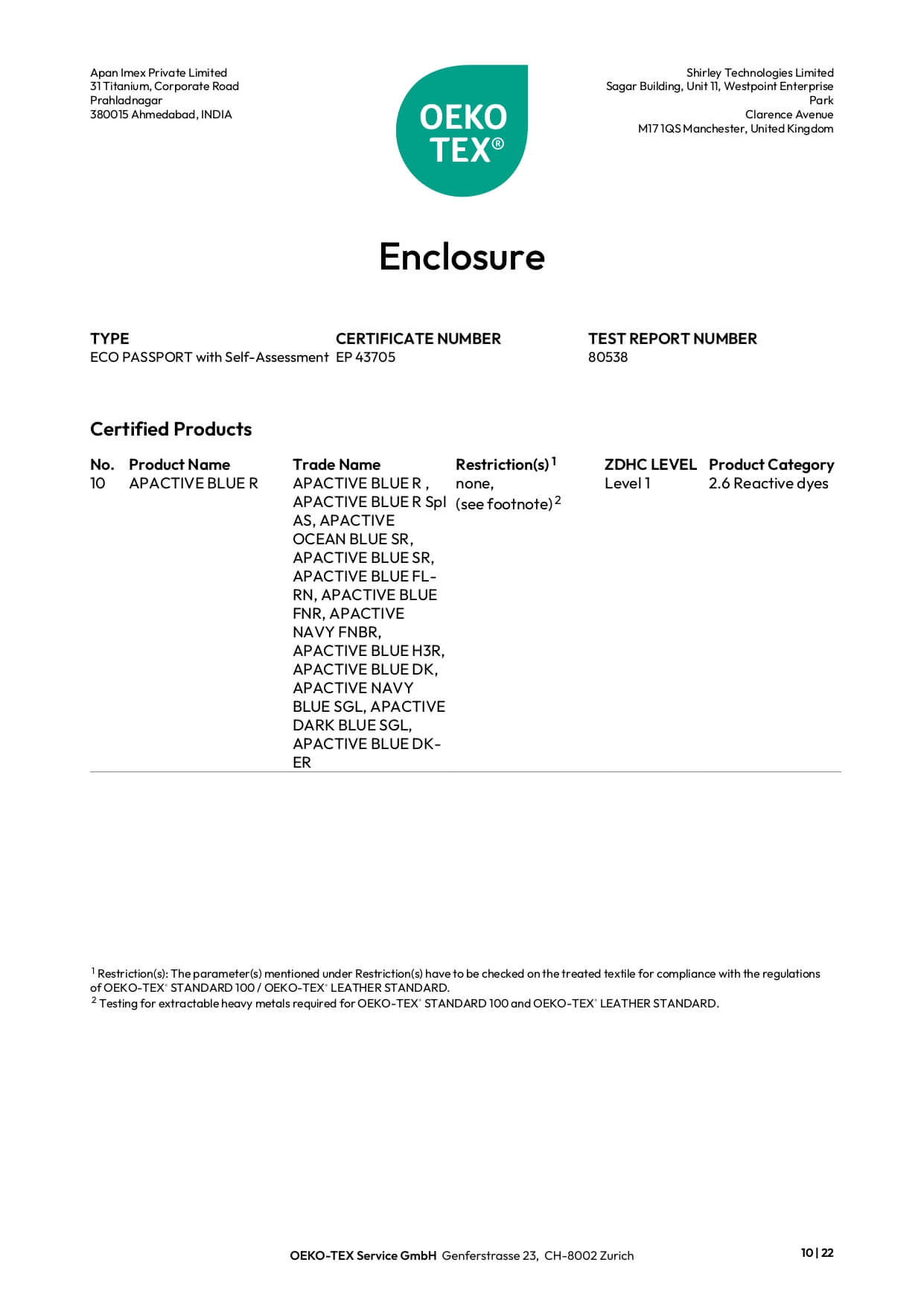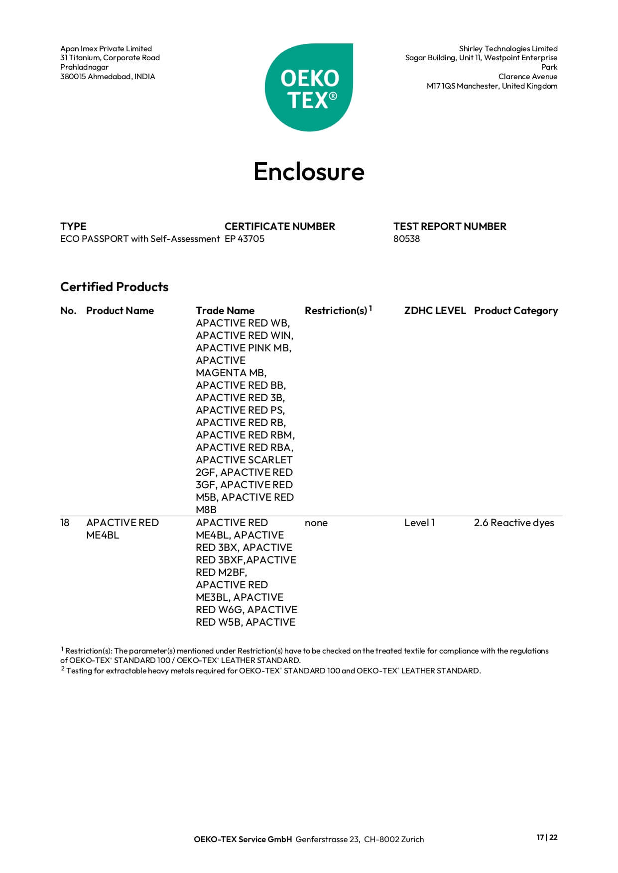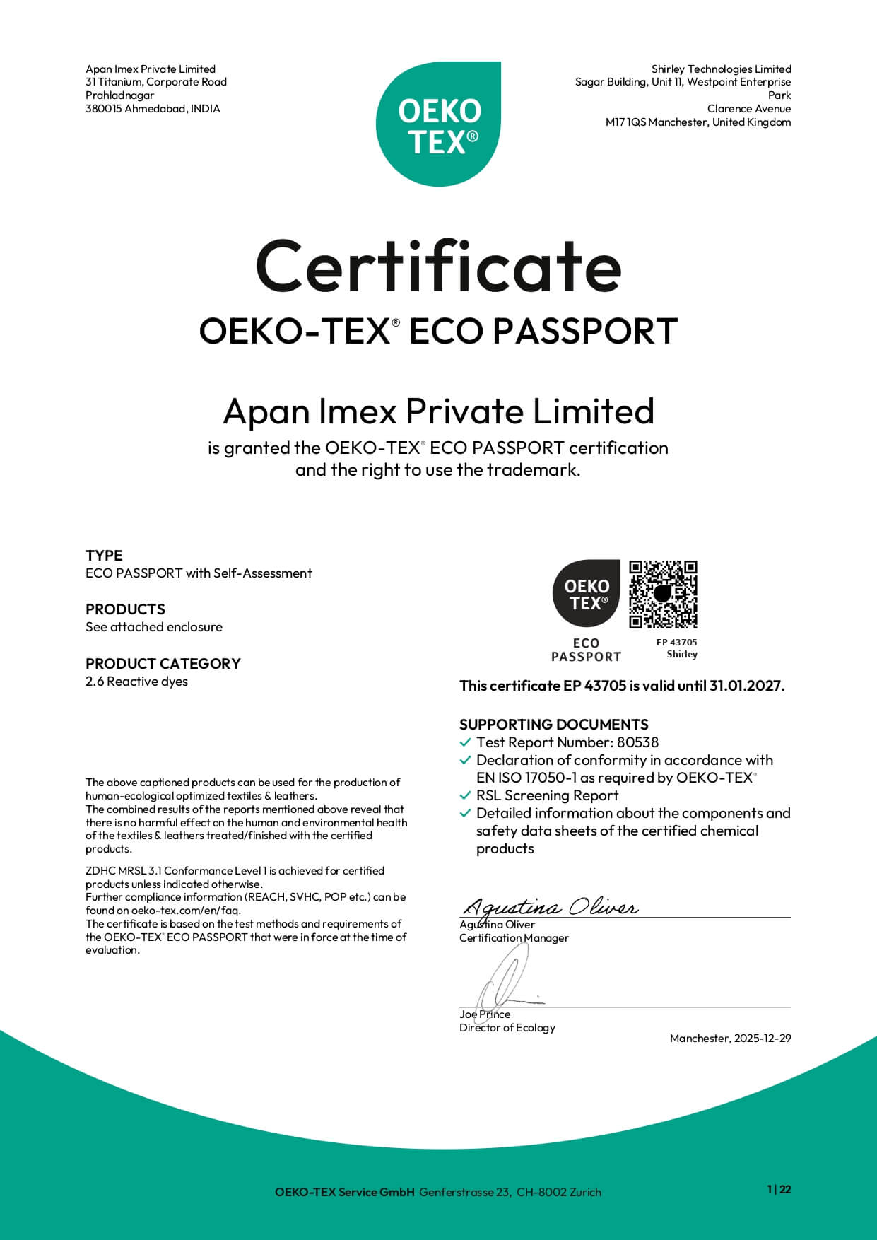 ECO PASSPORT CERTIFICATE REACTIVE DYES