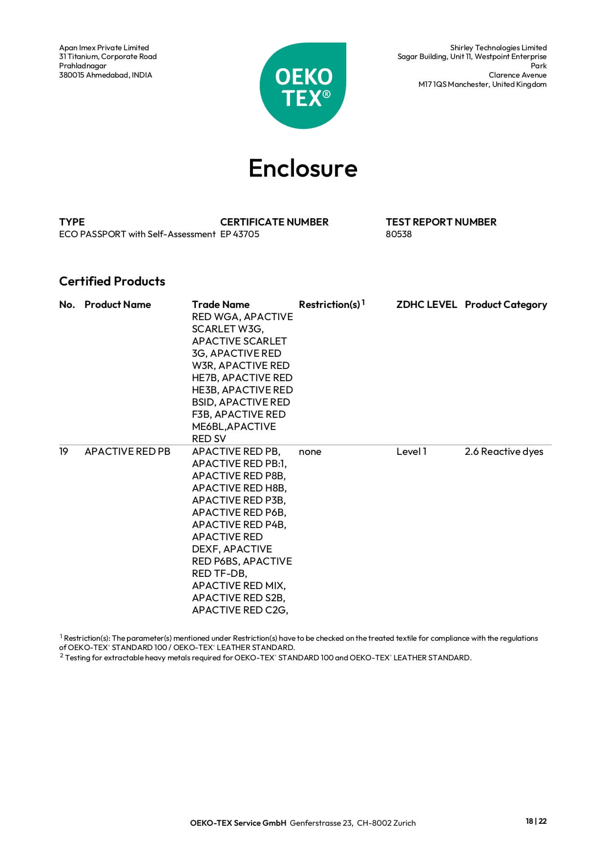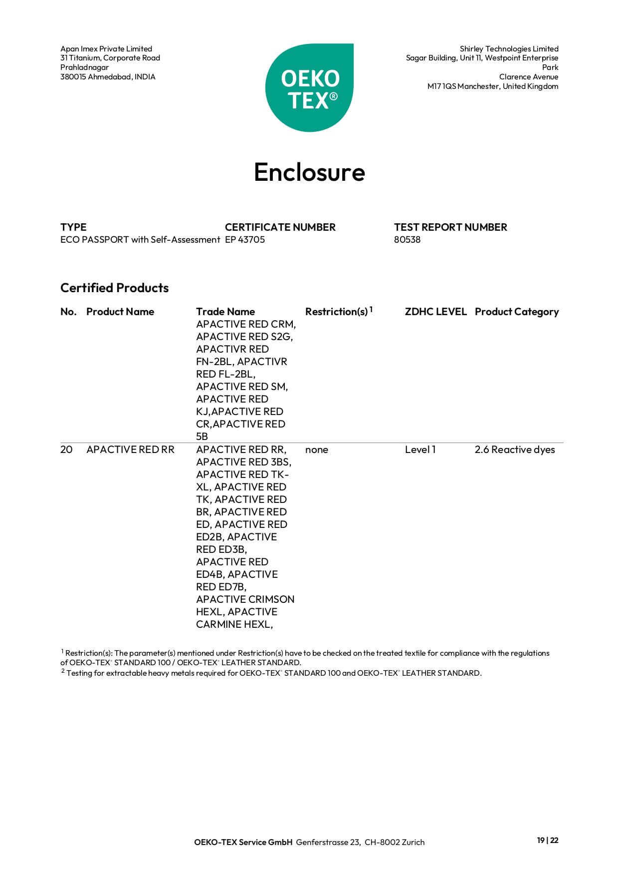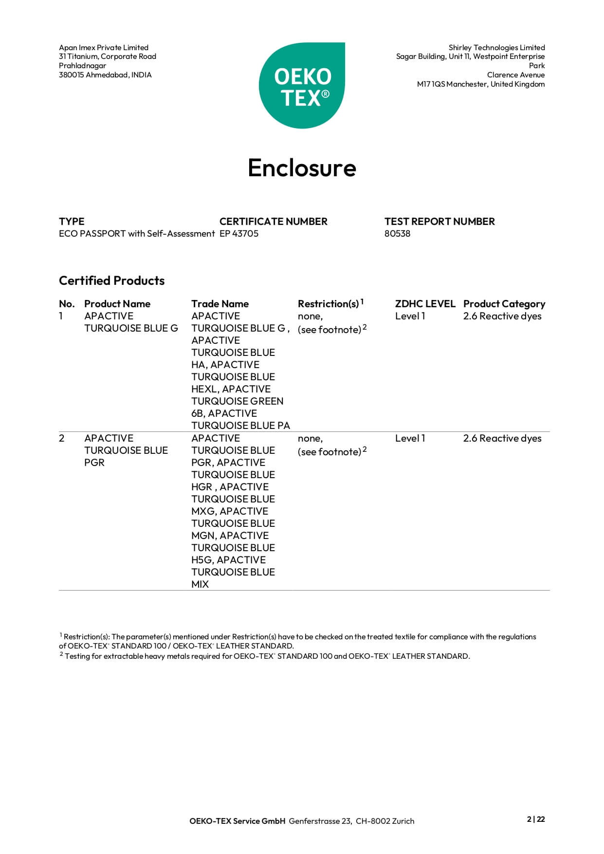 ECO PASSPORT CERTIFICATE REACTIVE DYES